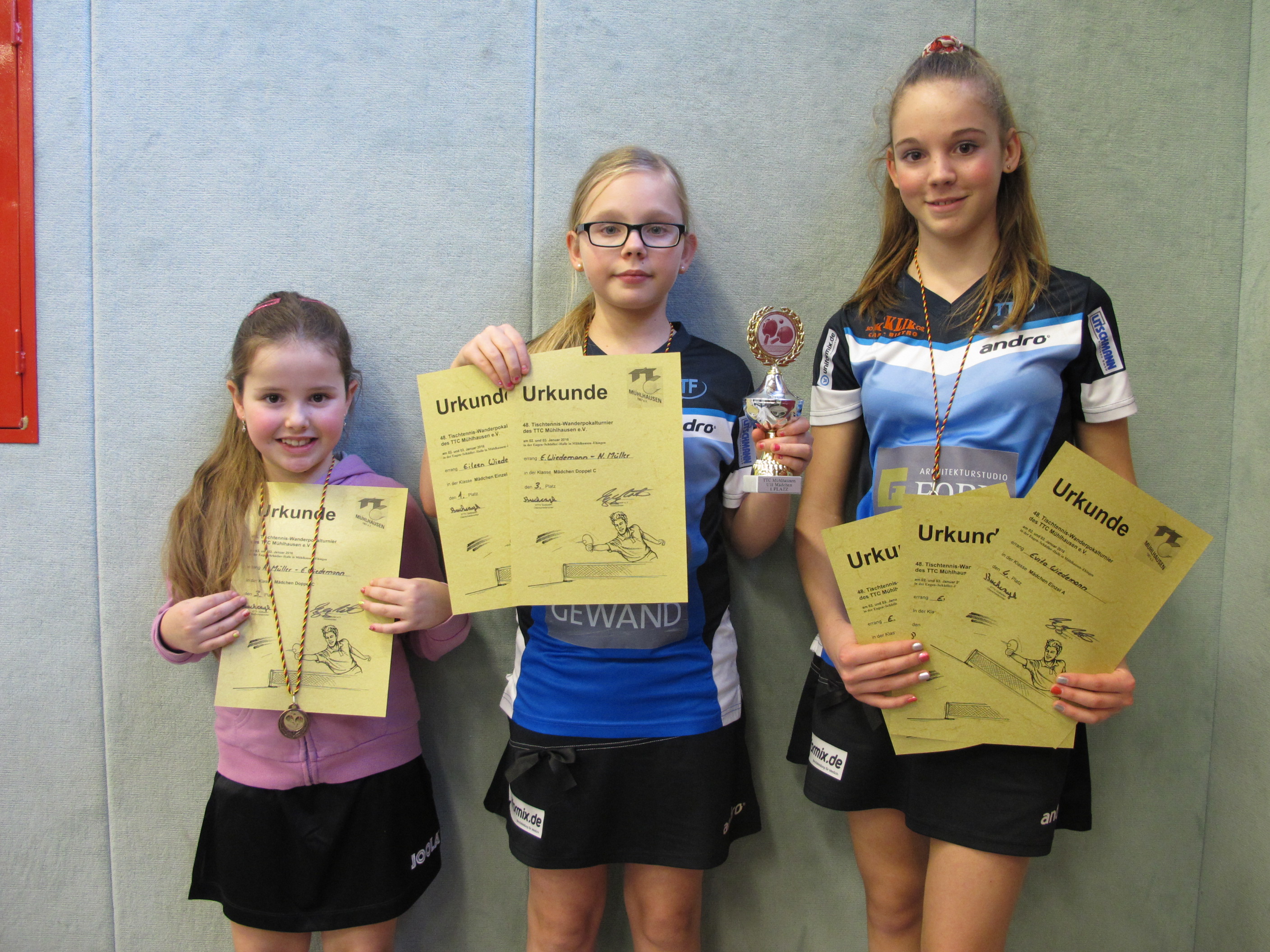 Am 02./03.01 trug der TTC Mühlhausen sein alljährliches Wanderpokalturnier aus. Bei den Aktiven starteten am Samstag Tatjana Lasarzick, Katja und Evita Wiedemann. Alle 3 mussten bei den Damen A starten. Was vor allem für Katja und Evita sehr schwer war. Tatjana konnte mit 2 Siegen ins Achtelfinale gelangen, wo sie dann aber leider im 5. Satz der darauffolgenden Konkurrentin unterlag.
