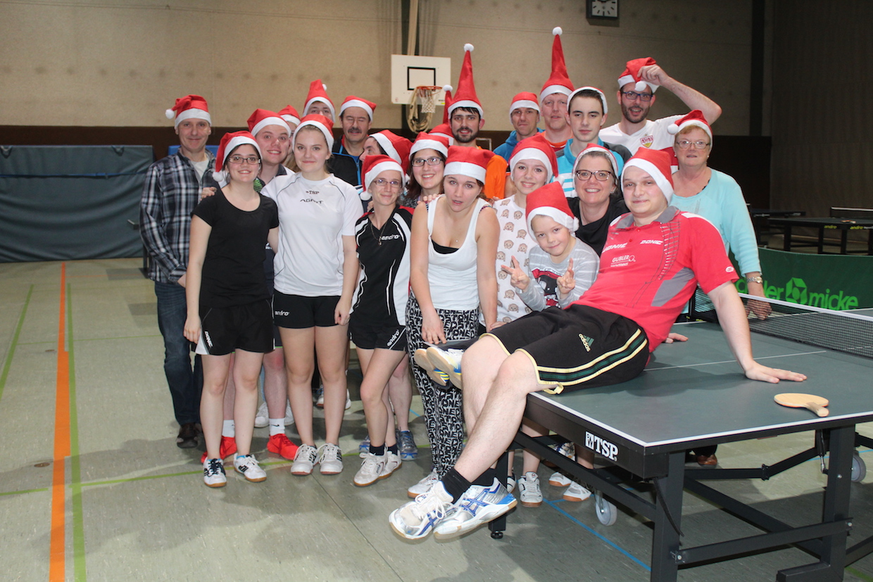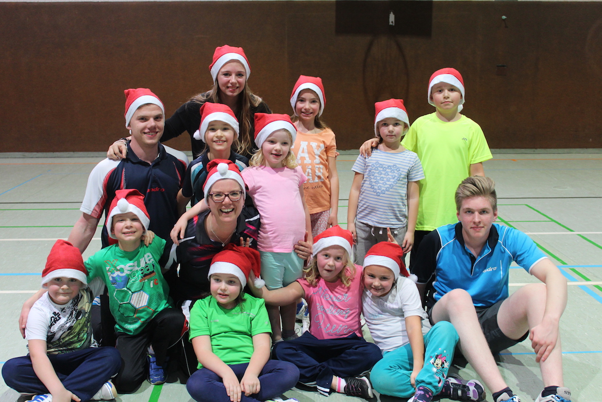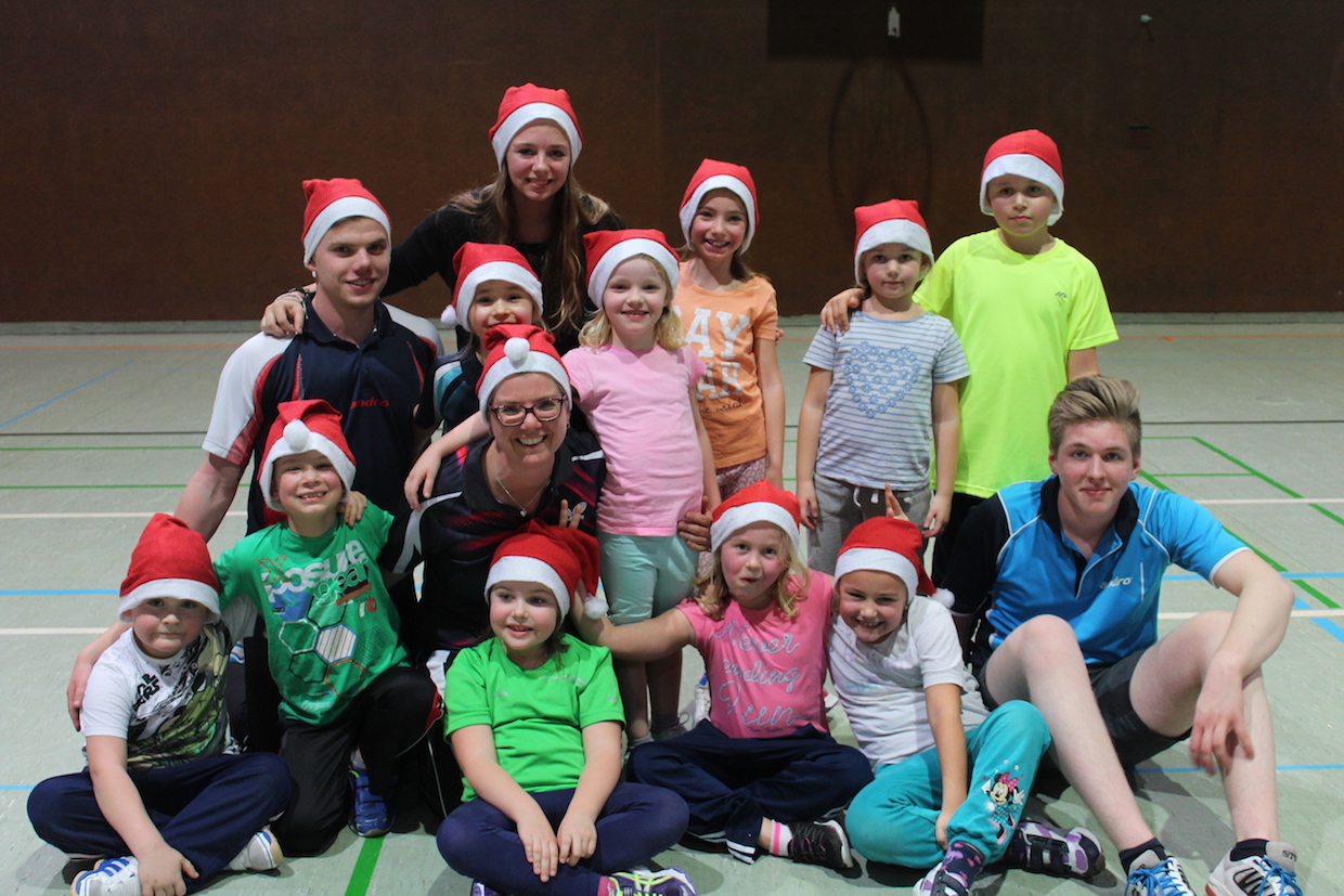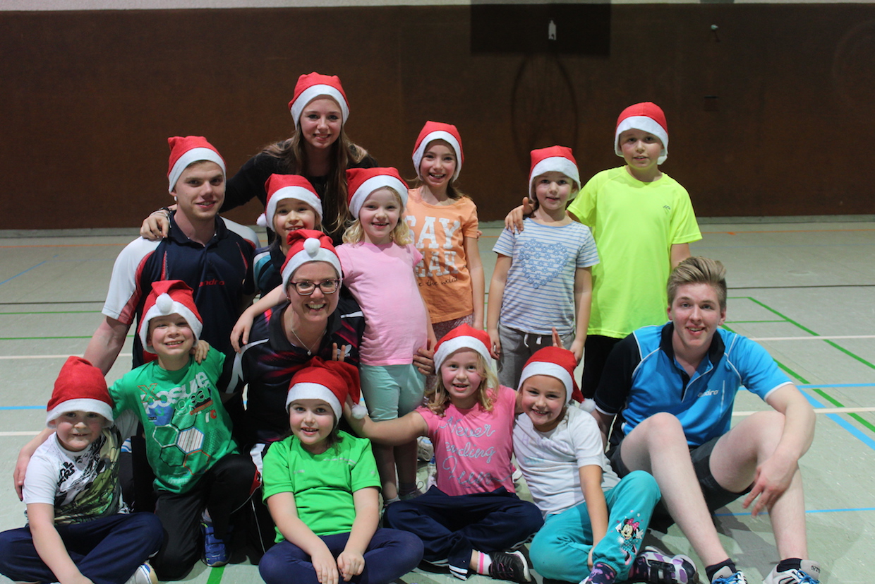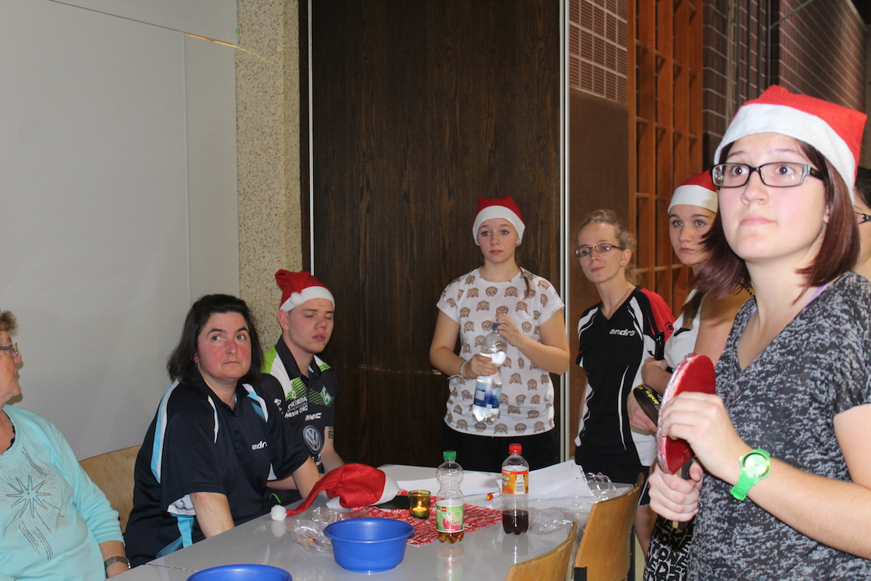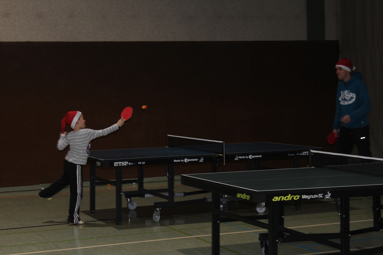 Die Feier der Mini- bzw. Anfängergruppe fand am Mittwoch, den 16.12. innerhalb des Tischtennis-trainings statt. Zuerst erhielten alle Anwesenden eine Nikolausmütze und spielten gemeinsam „Wer hat Angst vor’m schwarzen Mann“ und „Jägerball“ . Sehr schön war, dass alle Helfer – also Jens, Anna, Joshua, Anika, Alischa und Tatjana mit den TT-Kücken mitspielten und so war die Stimmung richtig super.