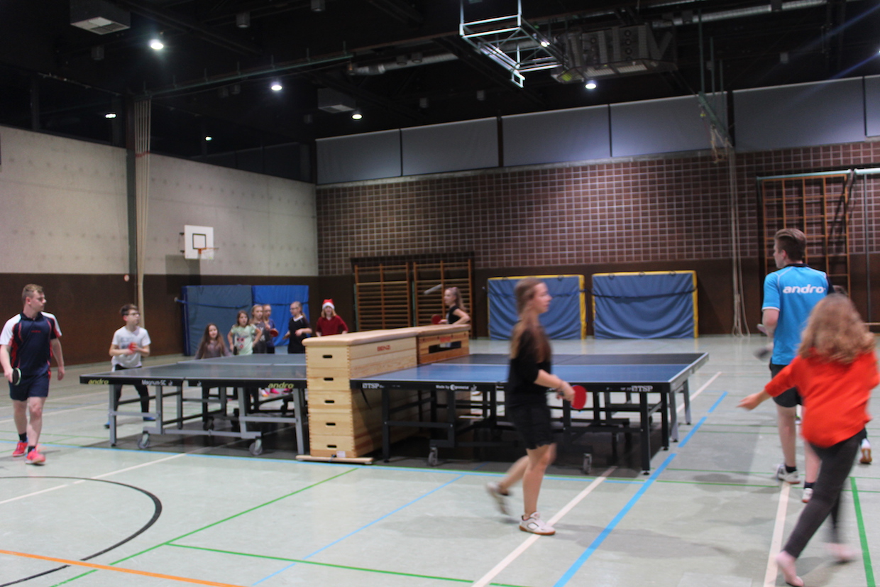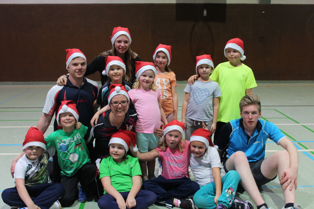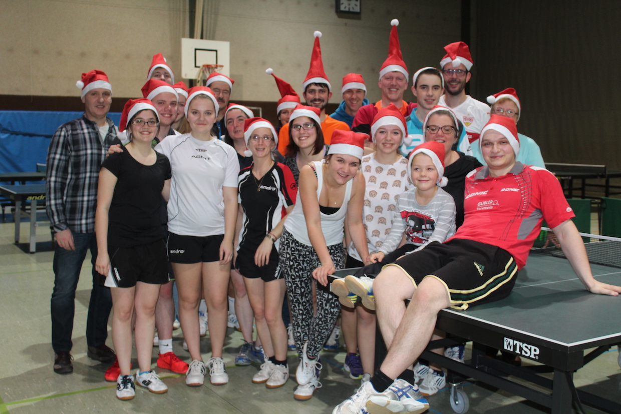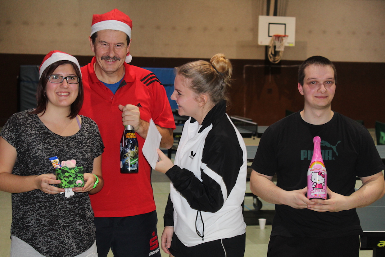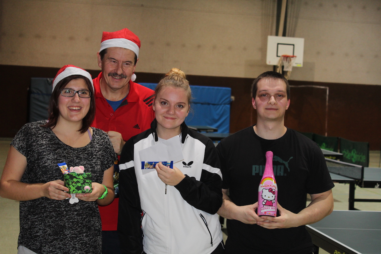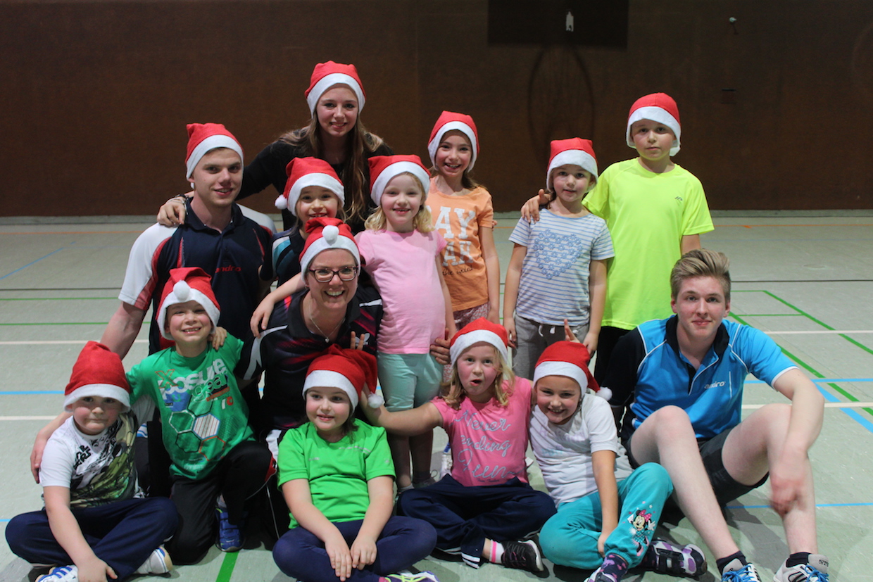 Die Feier der Mini- bzw. Anfängergruppe fand am Mittwoch, den 16.12. innerhalb des Tischtennis-trainings statt. Zuerst erhielten alle Anwesenden eine Nikolausmütze und spielten gemeinsam „Wer hat Angst vor’m schwarzen Mann“ und „Jägerball“ . Sehr schön war, dass alle Helfer – also Jens, Anna, Joshua, Anika, Alischa und Tatjana mit den TT-Kücken mitspielten und so war die Stimmung richtig super.