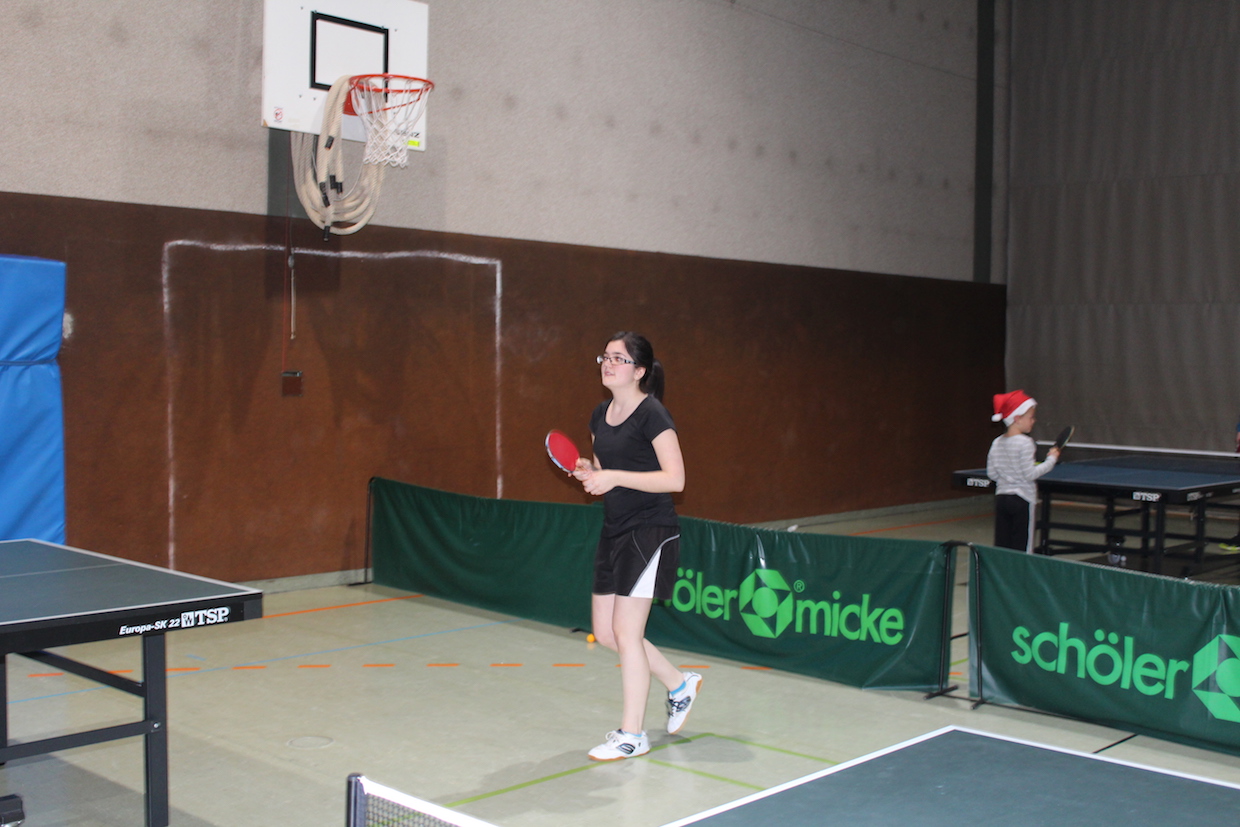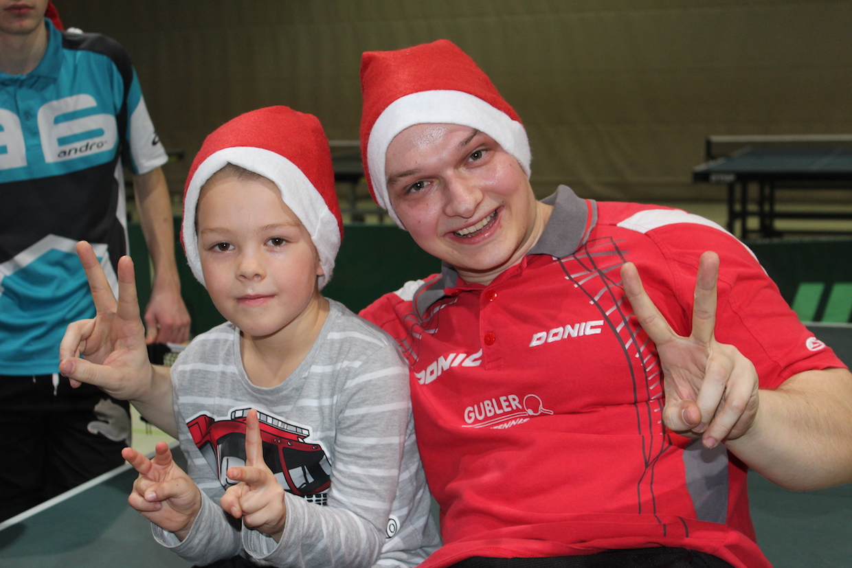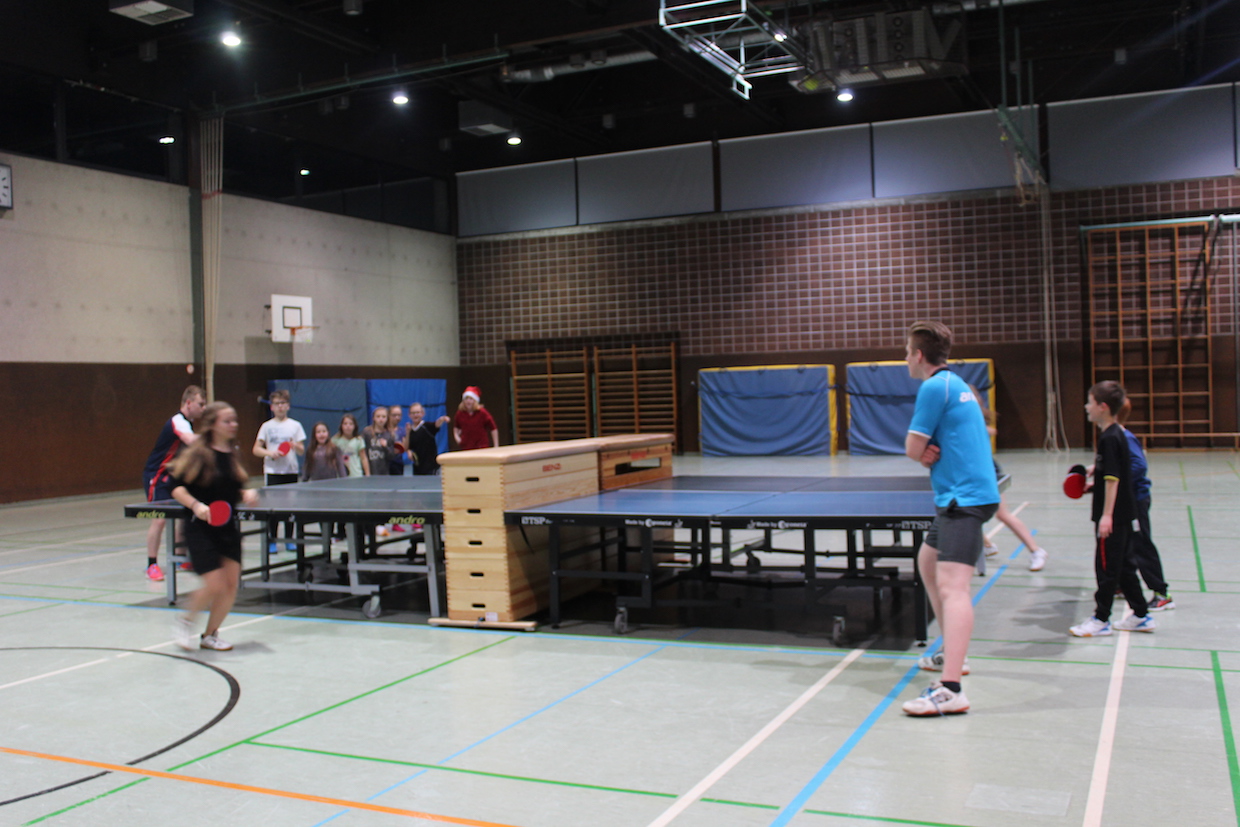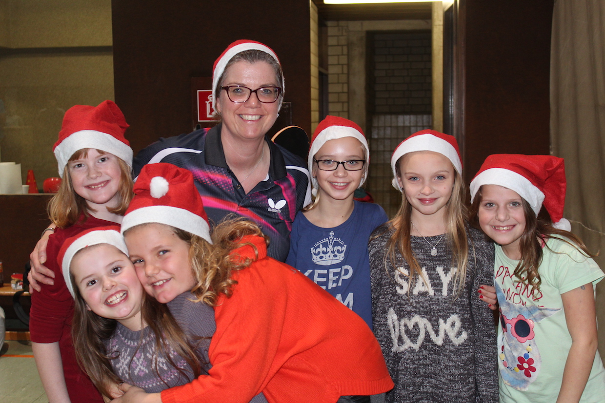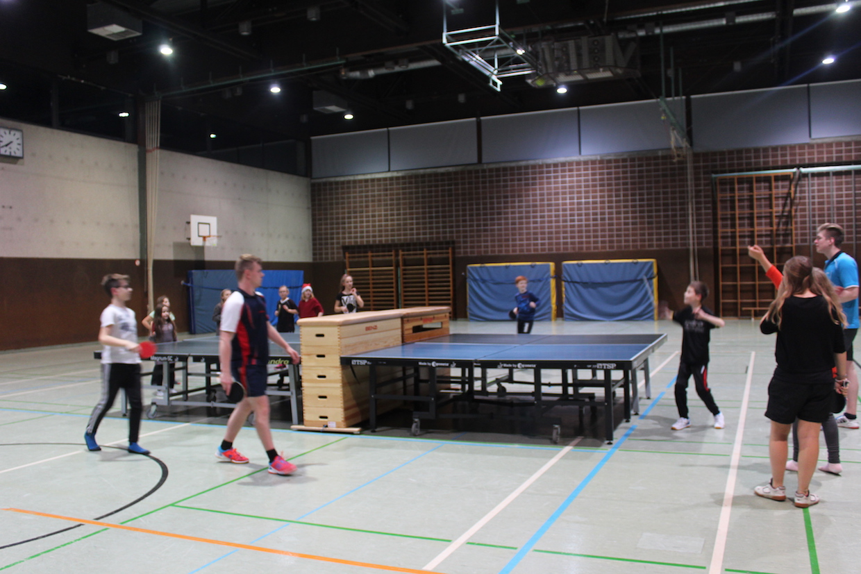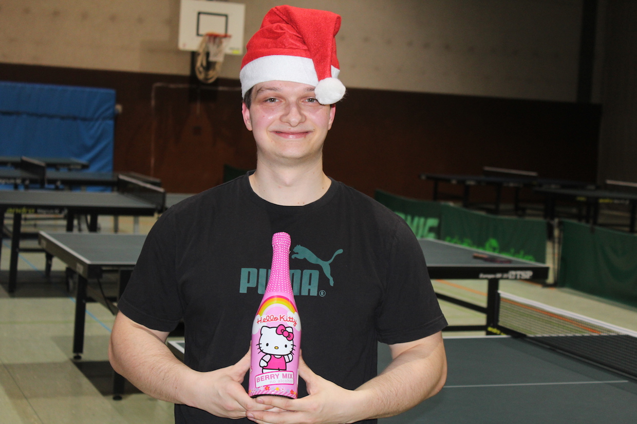 Die Feier der Mini- bzw. Anfängergruppe fand am Mittwoch, den 16.12. innerhalb des Tischtennis-trainings statt. Zuerst erhielten alle Anwesenden eine Nikolausmütze und spielten gemeinsam „Wer hat Angst vor’m schwarzen Mann“ und „Jägerball“ . Sehr schön war, dass alle Helfer – also Jens, Anna, Joshua, Anika, Alischa und Tatjana mit den TT-Kücken mitspielten und so war die Stimmung richtig super.