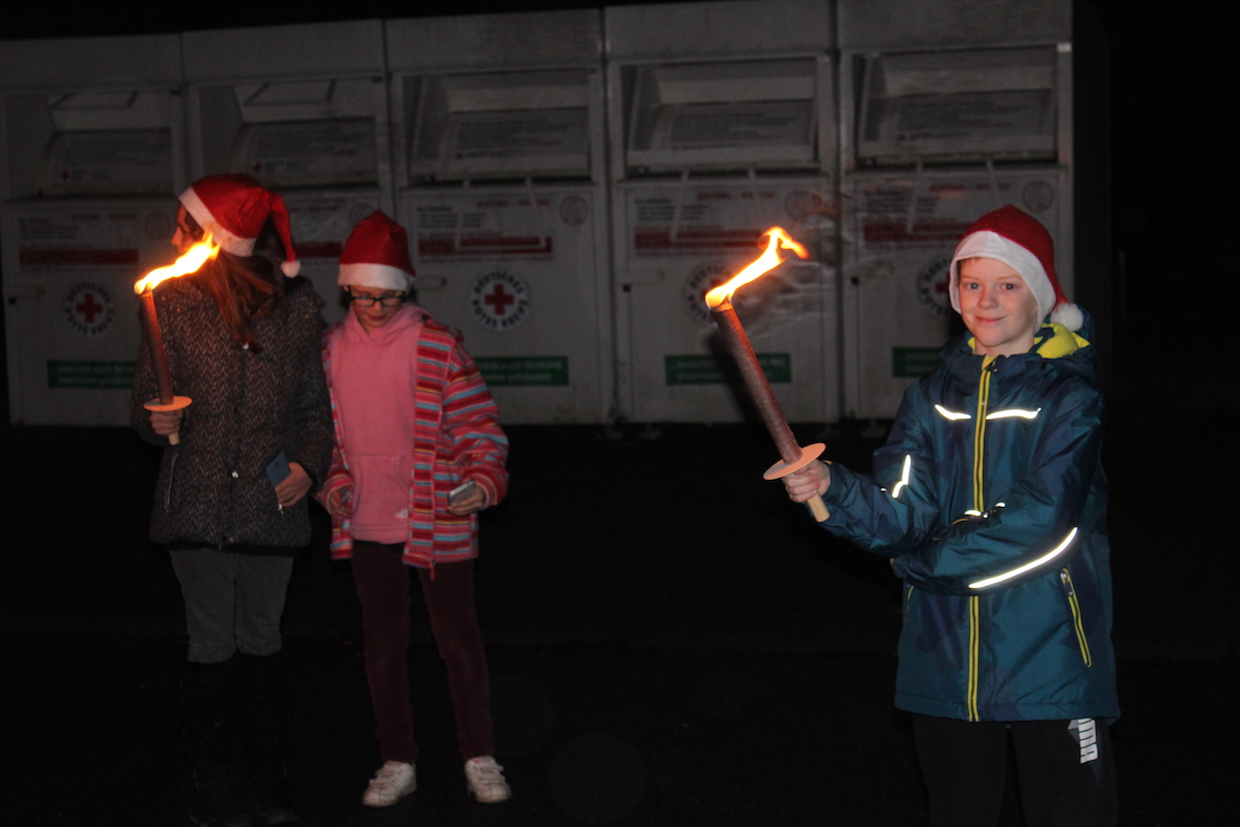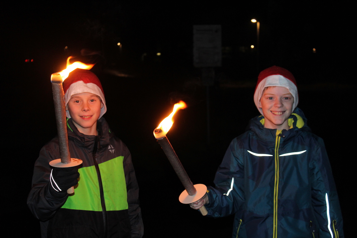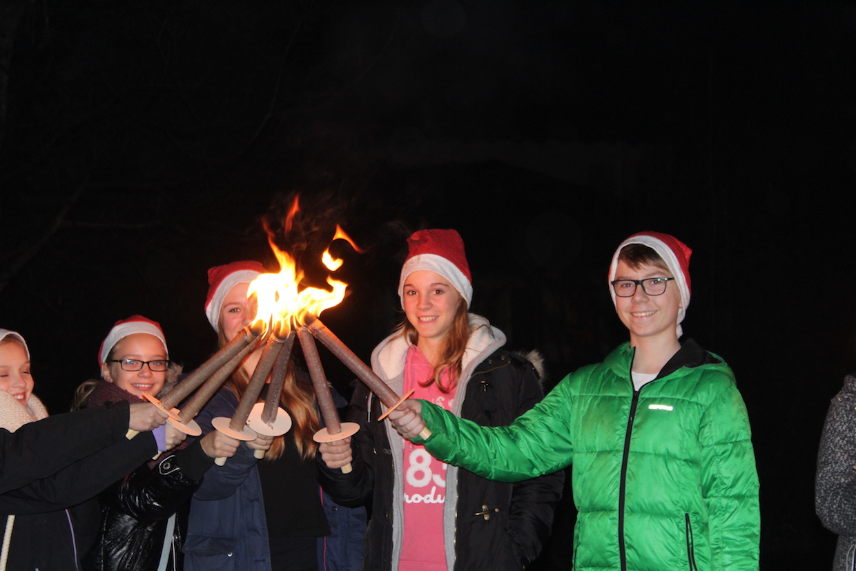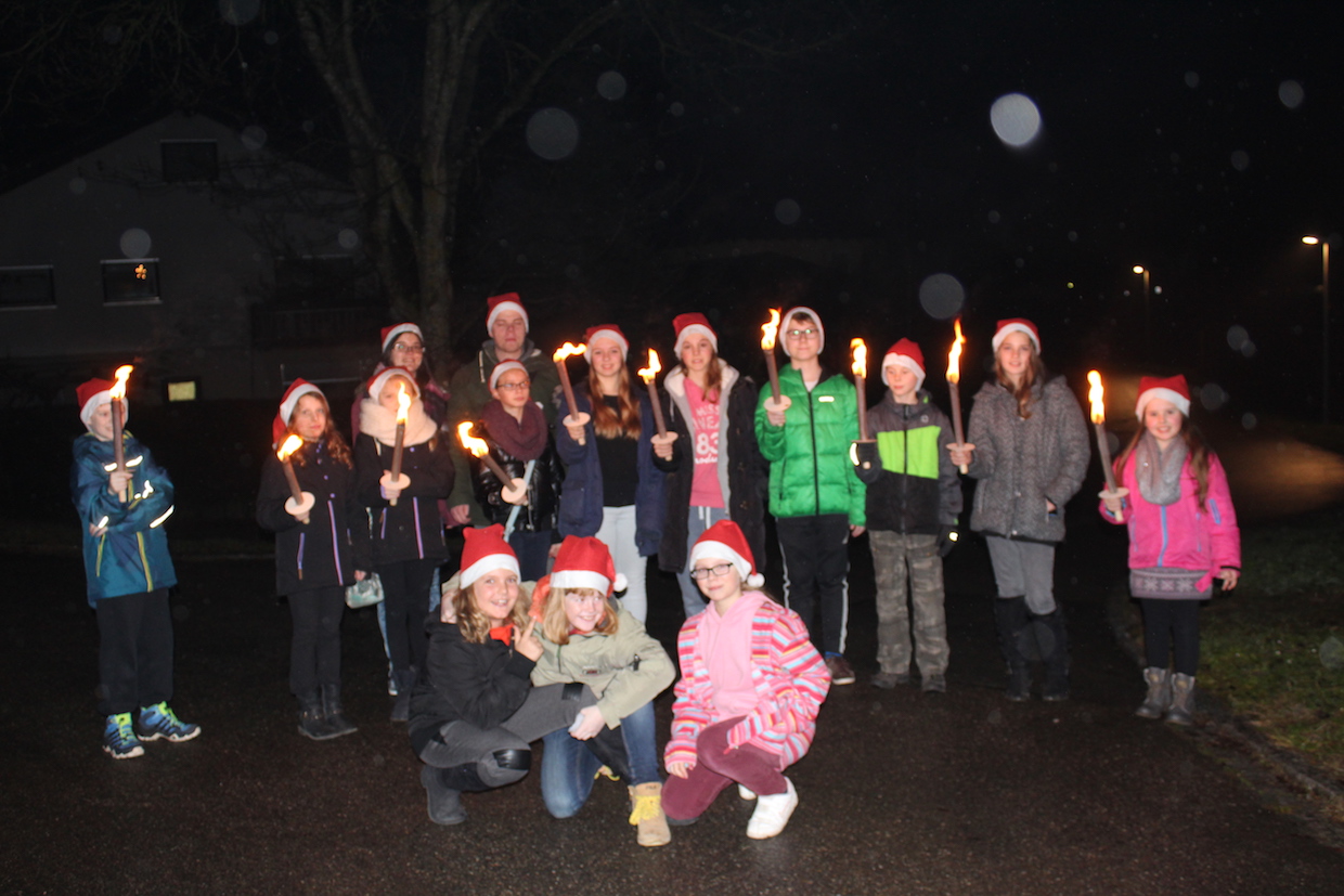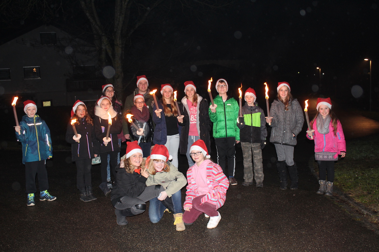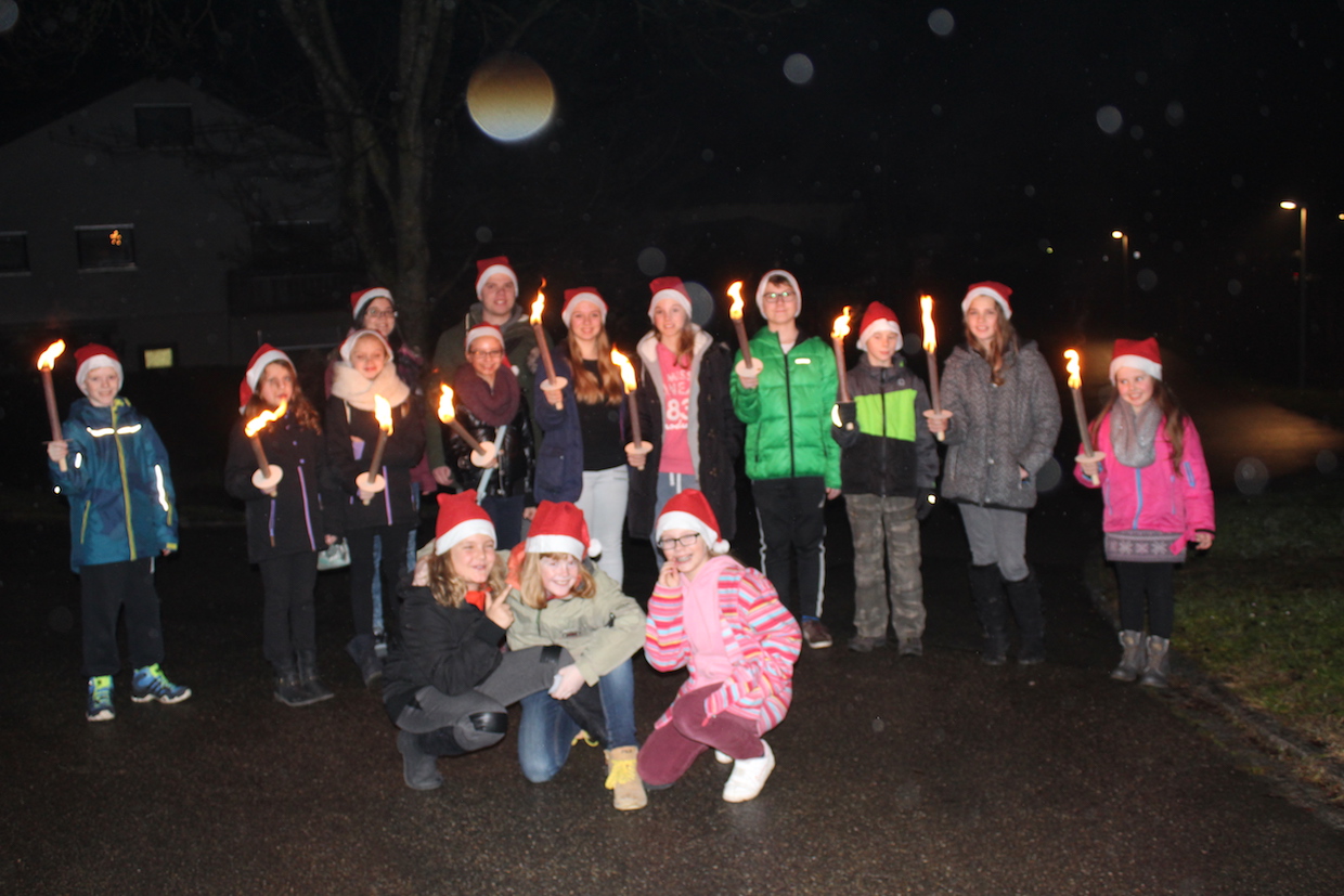 Die aktiven Kinder und Jugendlichen starten anschließend, ebenfalls ausgestattet mit Nikolaus-mützen, zur Fackelwanderung. Hungrig kam die Truppe wieder in der Halle an und wurde mit Punsch und Keksen versorgt. Einige Mädchen hatten sogar TTF-Kekse gebacken!!!! Beim anschl. Riesenrundlauf waren alle mit Feuereifer dabei.