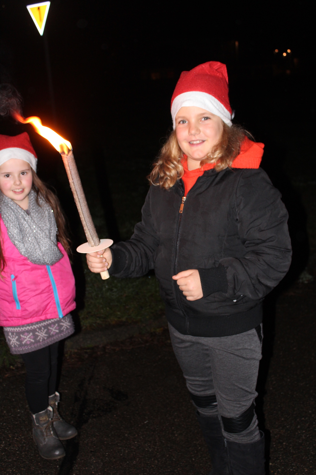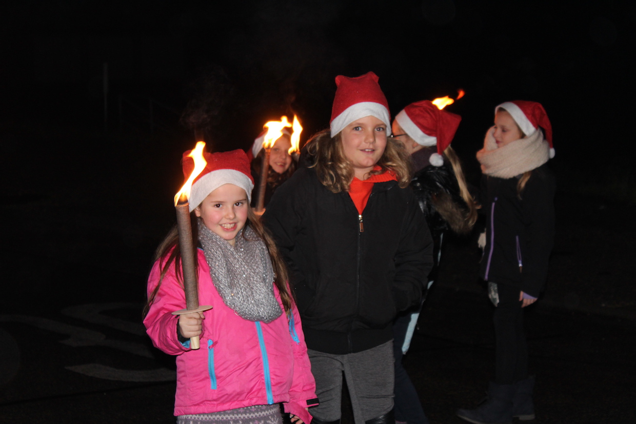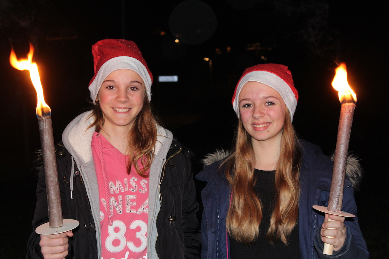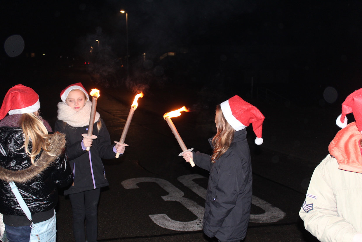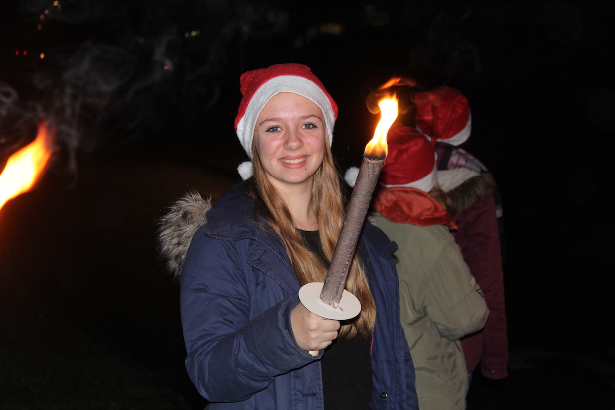 Die aktiven Kinder und Jugendlichen starten anschließend, ebenfalls ausgestattet mit Nikolaus-mützen, zur Fackelwanderung. Hungrig kam die Truppe wieder in der Halle an und wurde mit Punsch und Keksen versorgt. Einige Mädchen hatten sogar TTF-Kekse gebacken!!!! Beim anschl. Riesenrundlauf waren alle mit Feuereifer dabei.