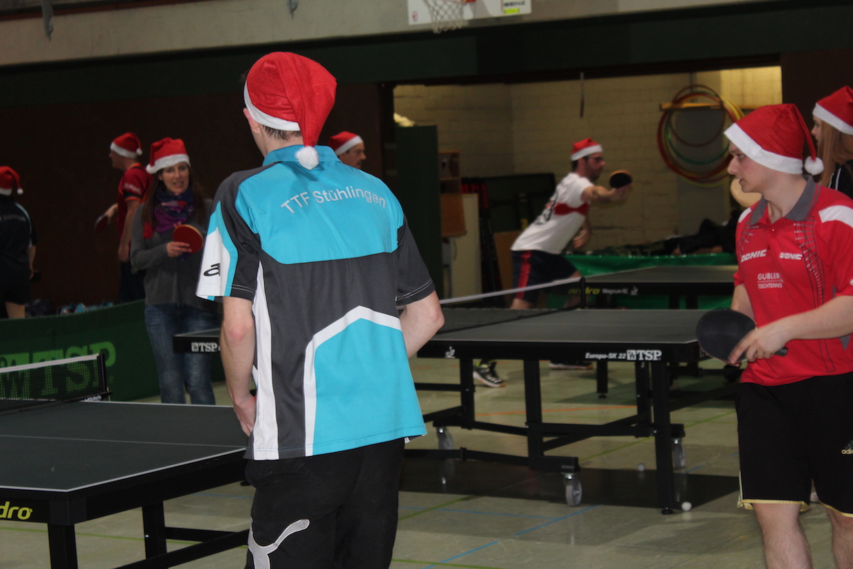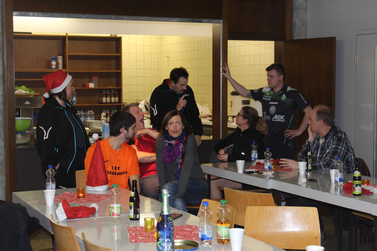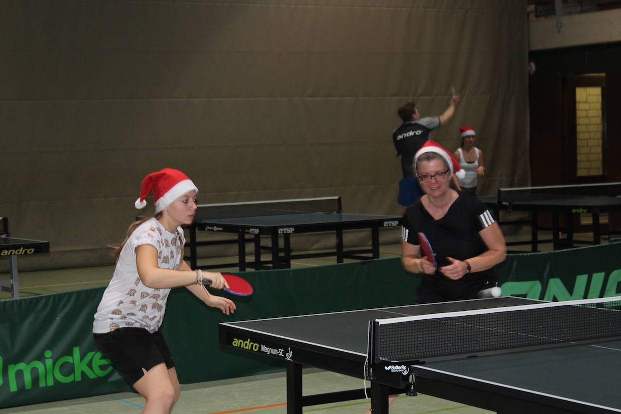 Etwas wehmütig spielten wir unser traditionelles Weihnachtsturnier: gespielt wird im Doppel/Mixed gegeneinander – jeweils ein Langsatz bis 30 Punkte. In jeder Runde werden die Partner neu ausgelost