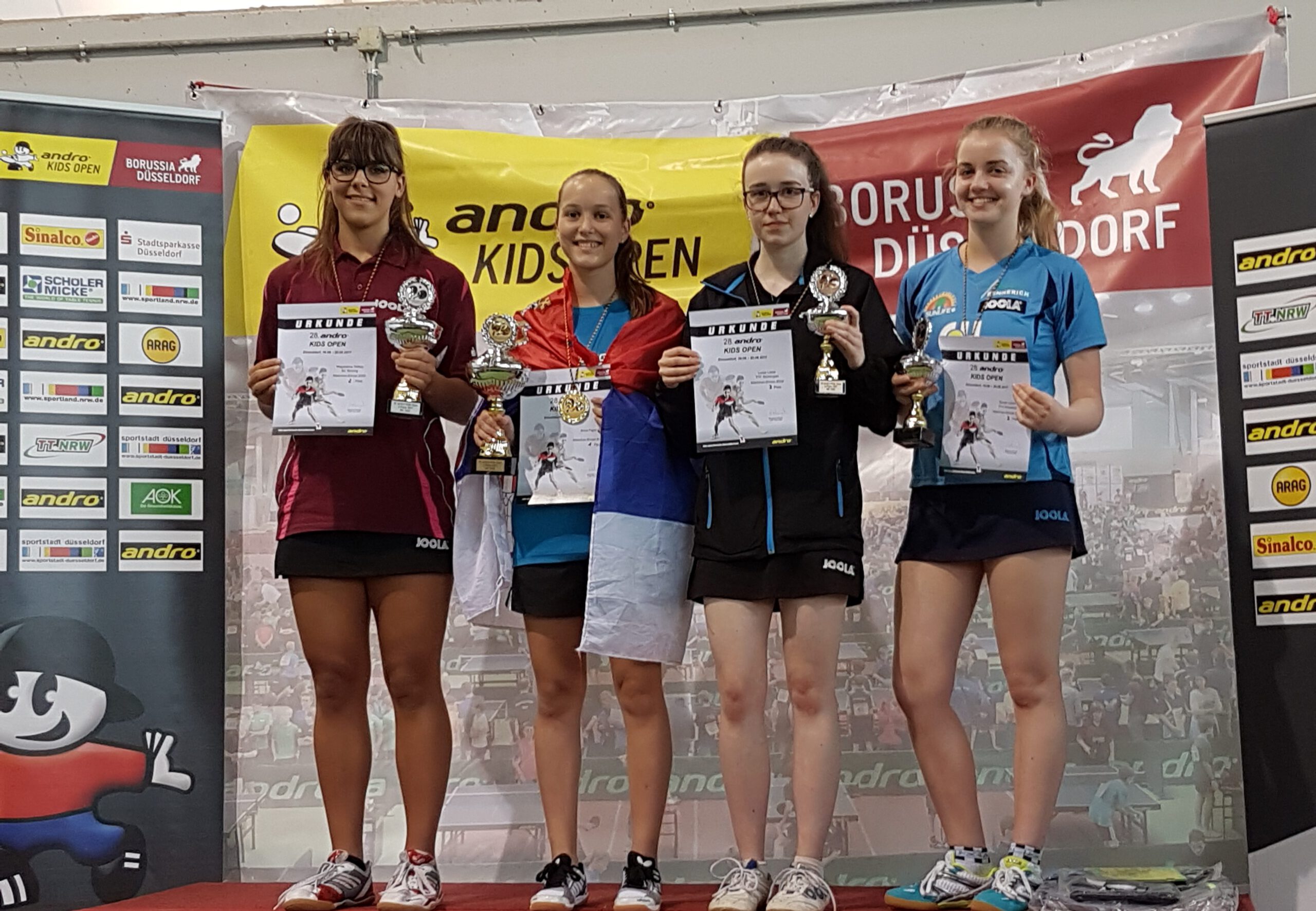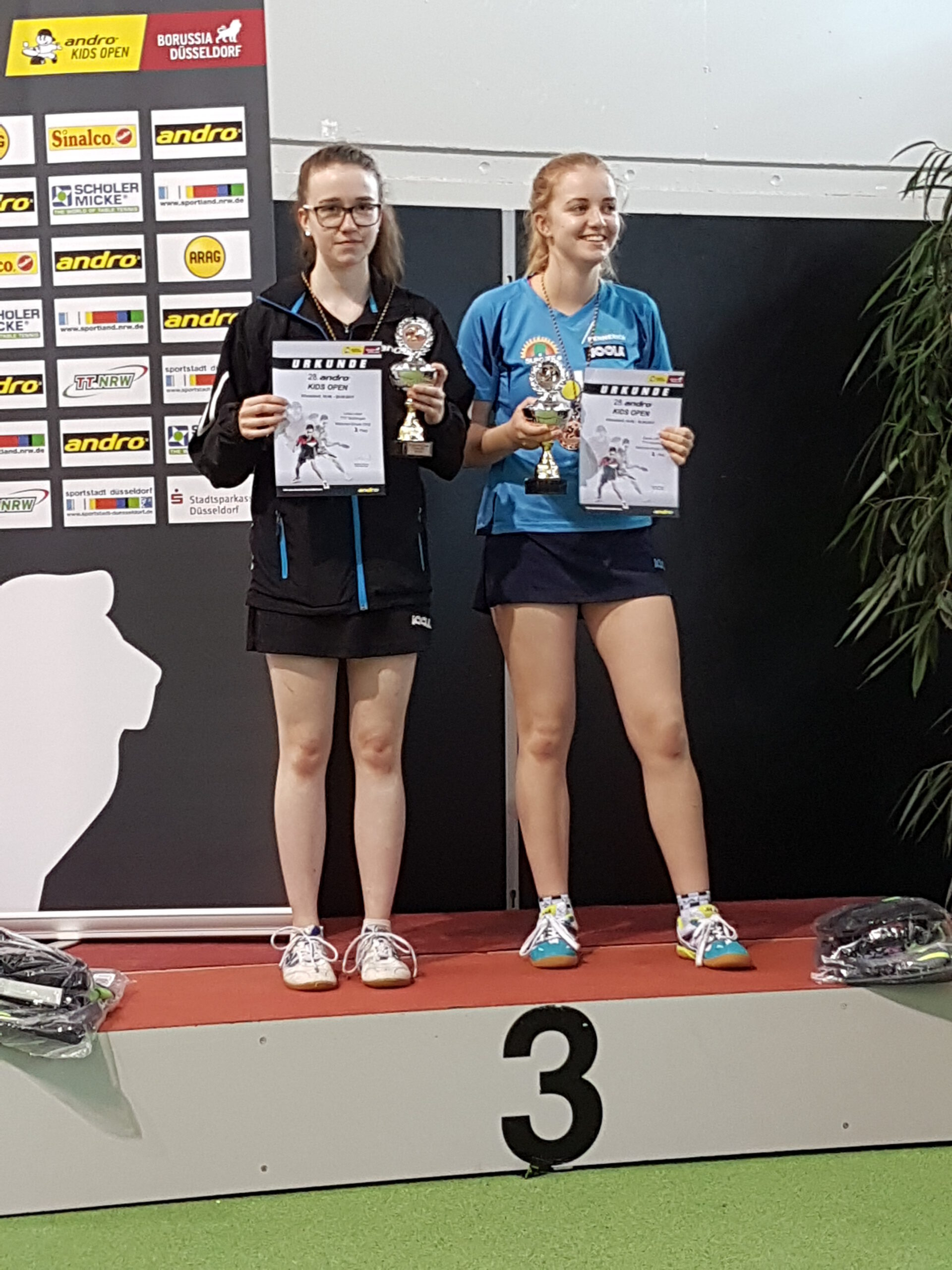 Beiden 28. internationalen Kids Open in Düsseldorf gingen ca. 1300 Kinder aus 26 Nationen an den Start, um in ihrer Altersklasse die Sieger auszuspielen. Luisa Leser war bei dem drei Tage andauerndem Event auch mit von der Partie. Freitags wurde dieses Jahr eine Doppelmeisterschaft ausgetragen, bei der Luisa und ihre Partnerin aus Betzingen sich sensationell bis ins Finale kämpften, wo sie dann dem Gegner nach hartem Kampf zum Sieg gratulieren mussten. Am Samstag wurde der Einzelwettbewerb gestartet, wo Luisa sich als Gruppenerste für die K.O. Runde qualifizierte. Luisa kam nach tollen Spielen bis ins Halbfinale wo sie ihrer Gegnerin aus Bayern mit 1:3 unterlag und damit den dritten Platz erreichte. Mit zwei Podest Plätzen im Gepäck trat Luisa glücklich die Heimreise an.